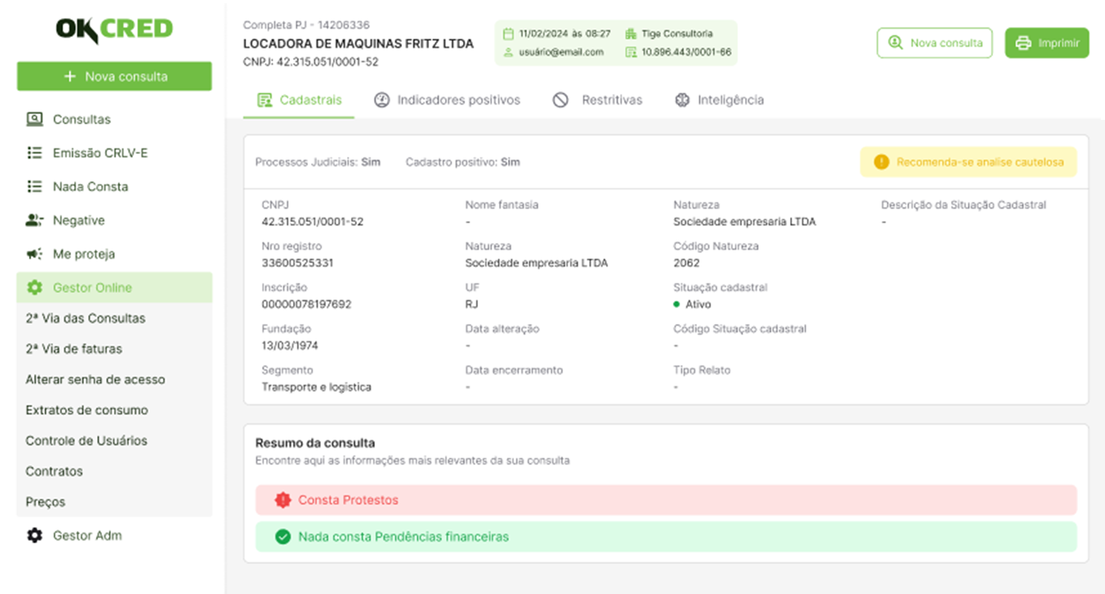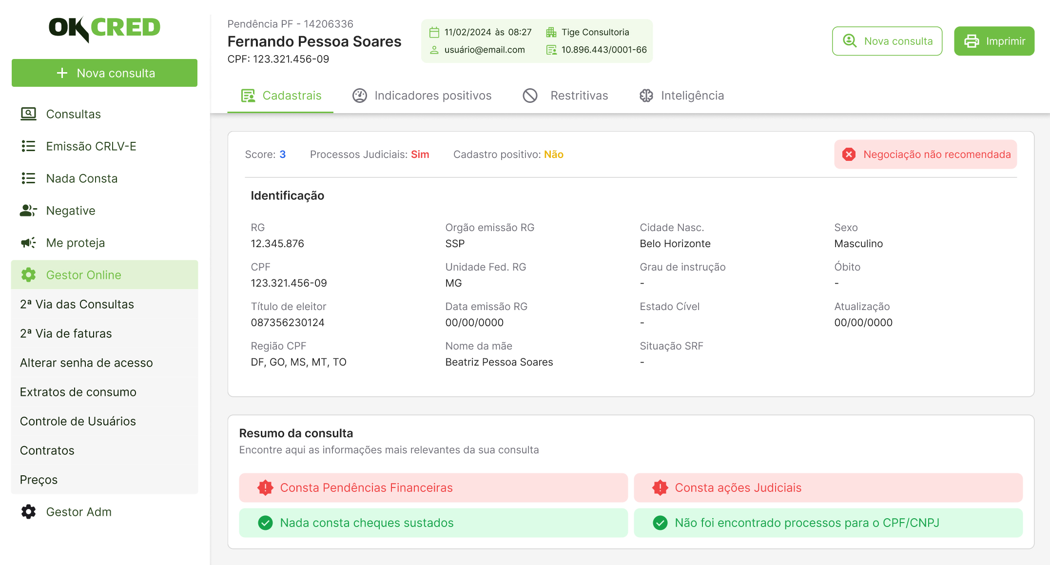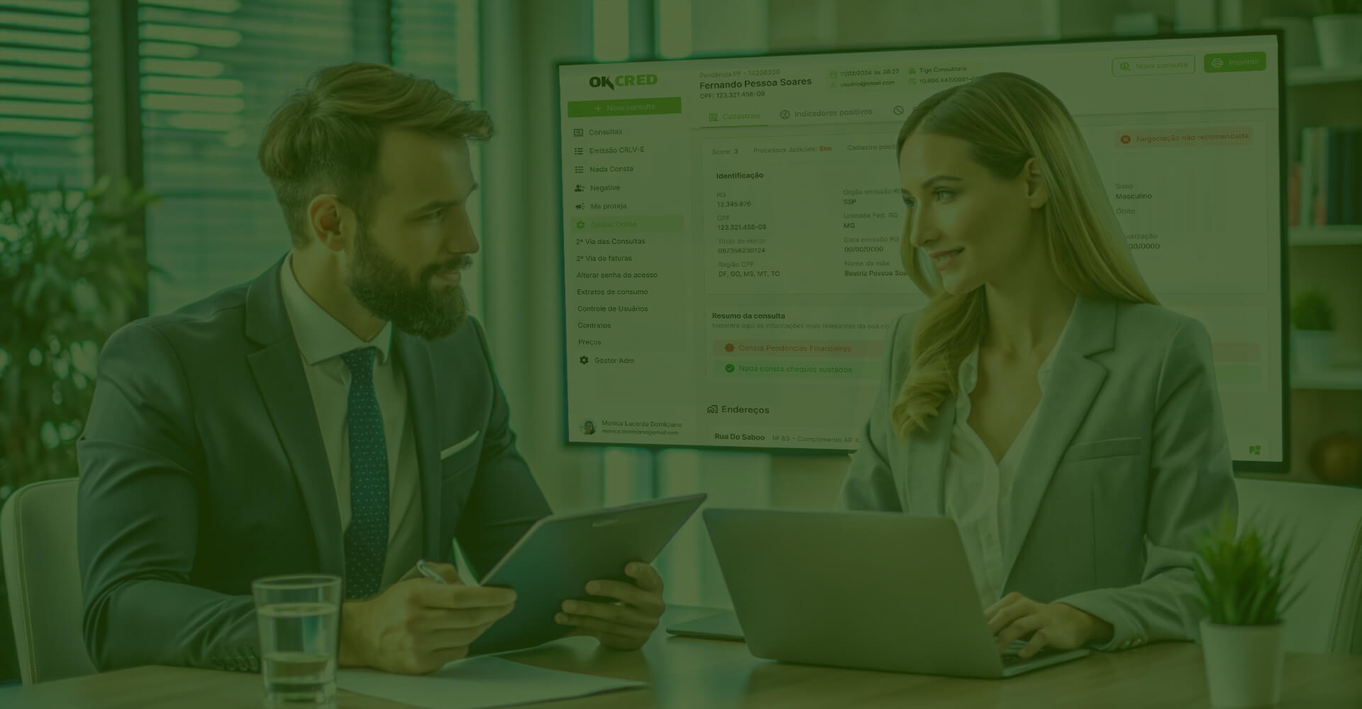 A Ok Cred é uma plataforma completa de análise e proteção de crédito. Atuamos há mais de 30 anos, apoiando empresas de todos os portes a venderem com mais segurança, reduzindo inadimplência e evitando surpresas jurídicas.